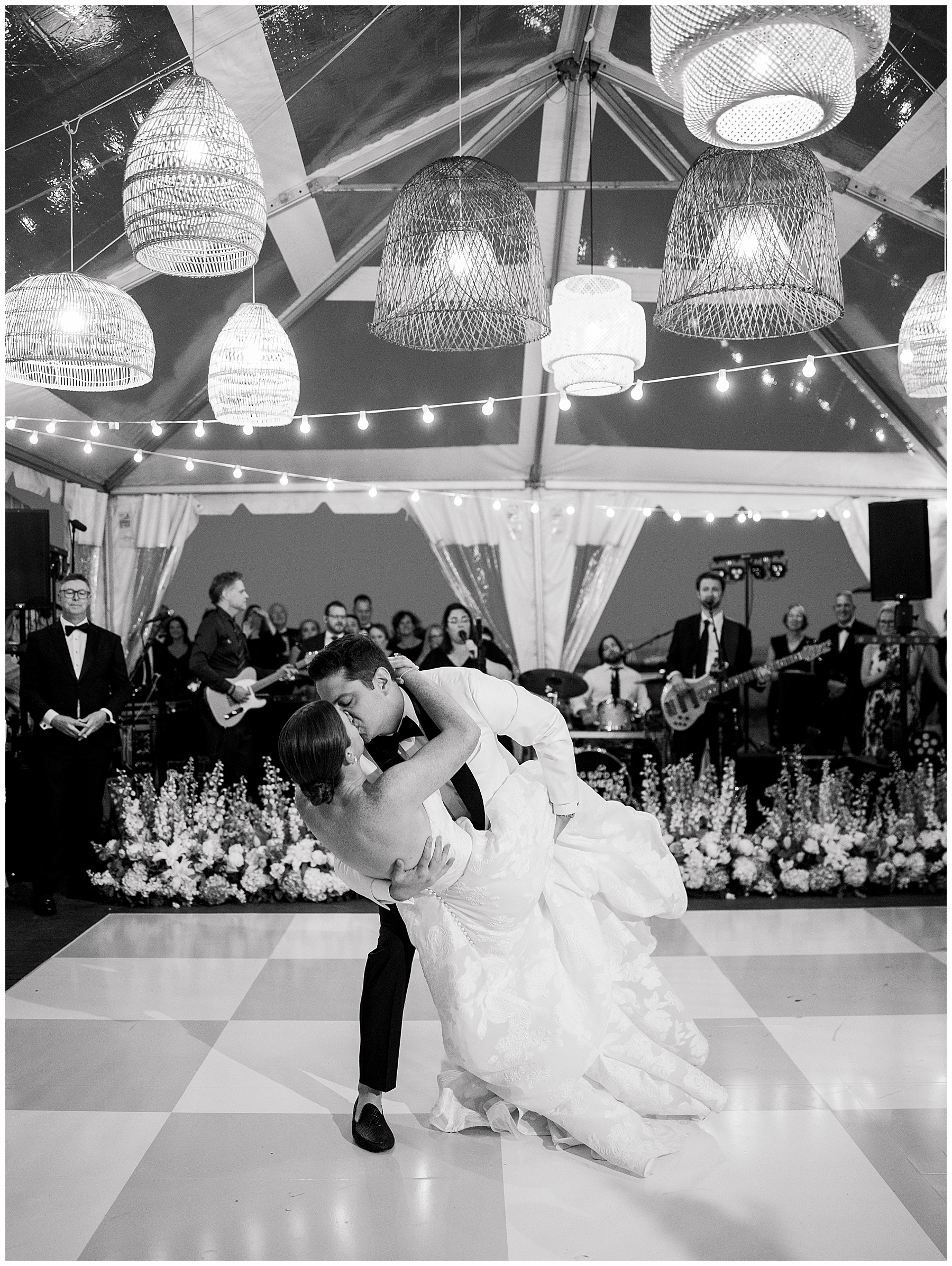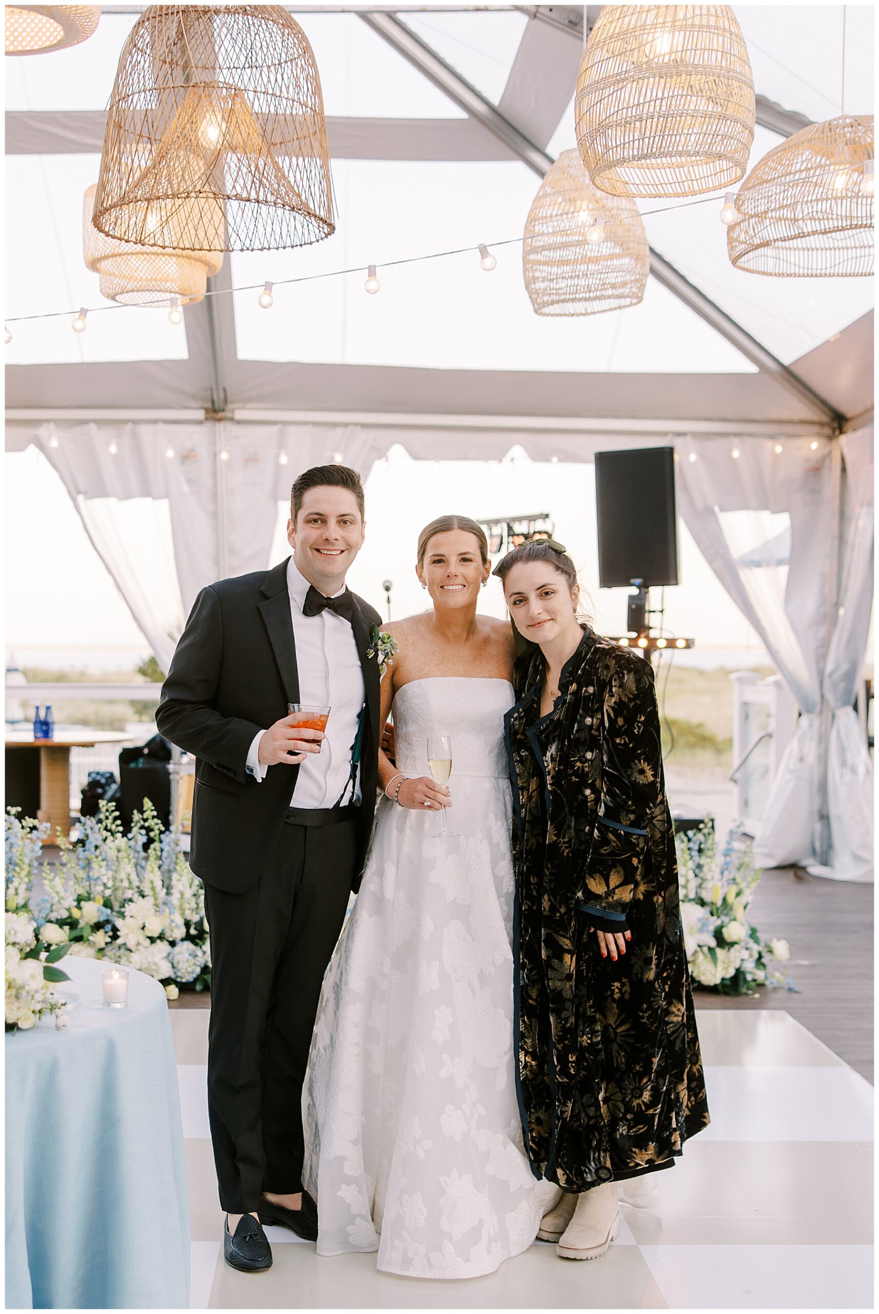 Their cocktail hour flowed effortlessly into an unforgettable reception filled with incredible design, packed dance floors, and nonstop energy.  The entire day was personalized to fit their vision and it was a beautiful one. Gorgeous flower arrangements lined the dance floor by the stage where the band played. The rattan pendant lighting over the dance floor was another favorite, and tied into the coastal setting. Caitlin and Brian leaned into an elegant color palette of blue, green, and soft off-white, which was a perfect complement to the classic seaside setting.